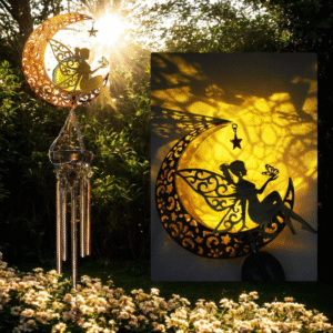 Su diseño único combina la silueta de un hada con alas delicadas, posada sobre una media luna dorada mientras sostiene una mariposa, creando un efecto de ensueño tanto de día como de noche. Gracias a su esfera solar, al caer la noche proyecta sombras doradas y figuras encantadoras en paredes y suelos, llenando el ambiente de calidez y fantasía.