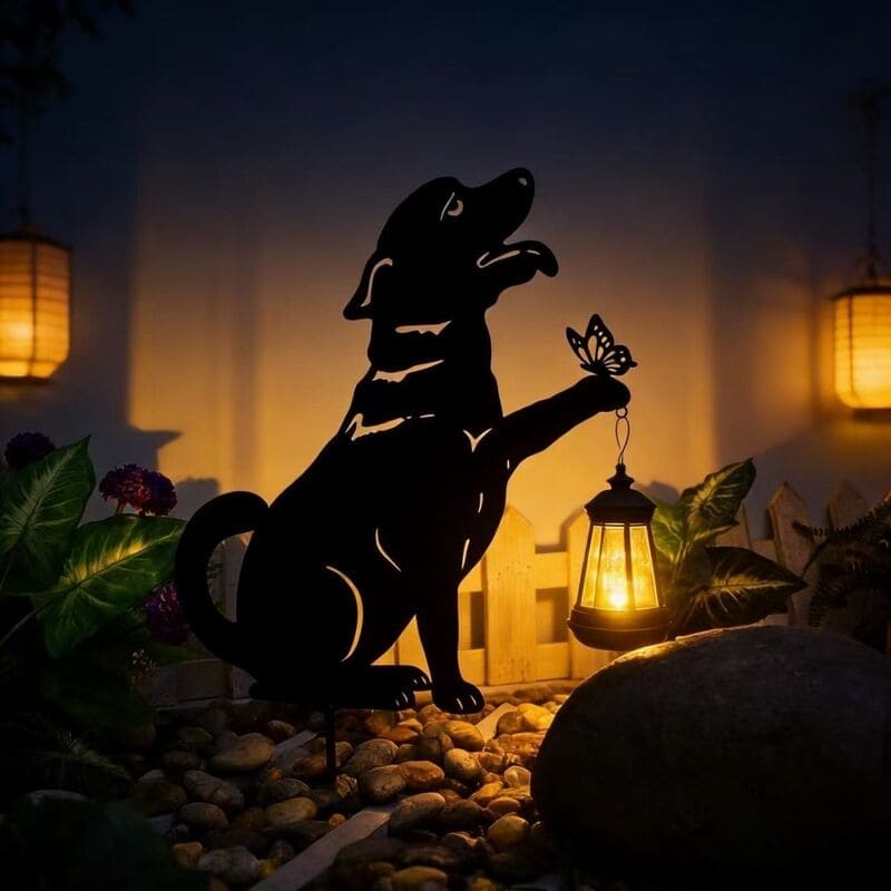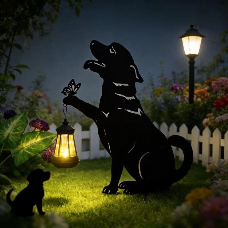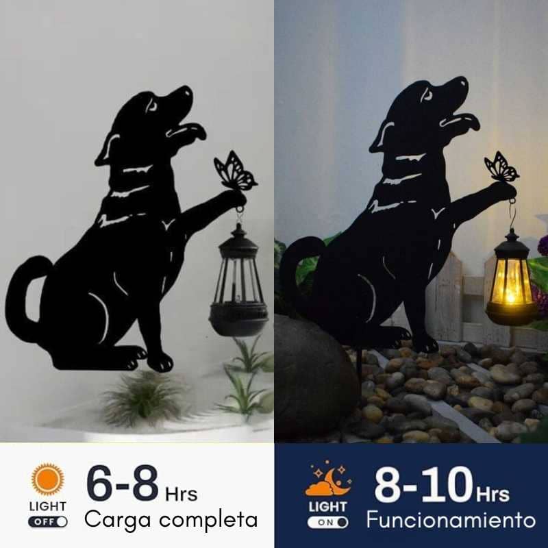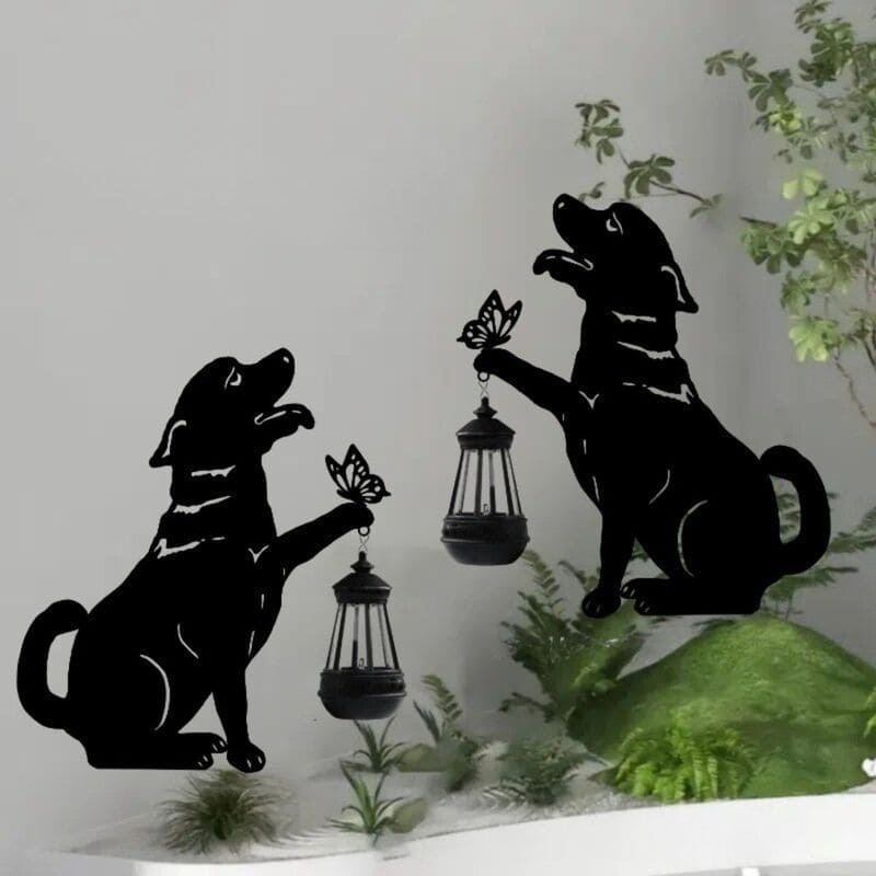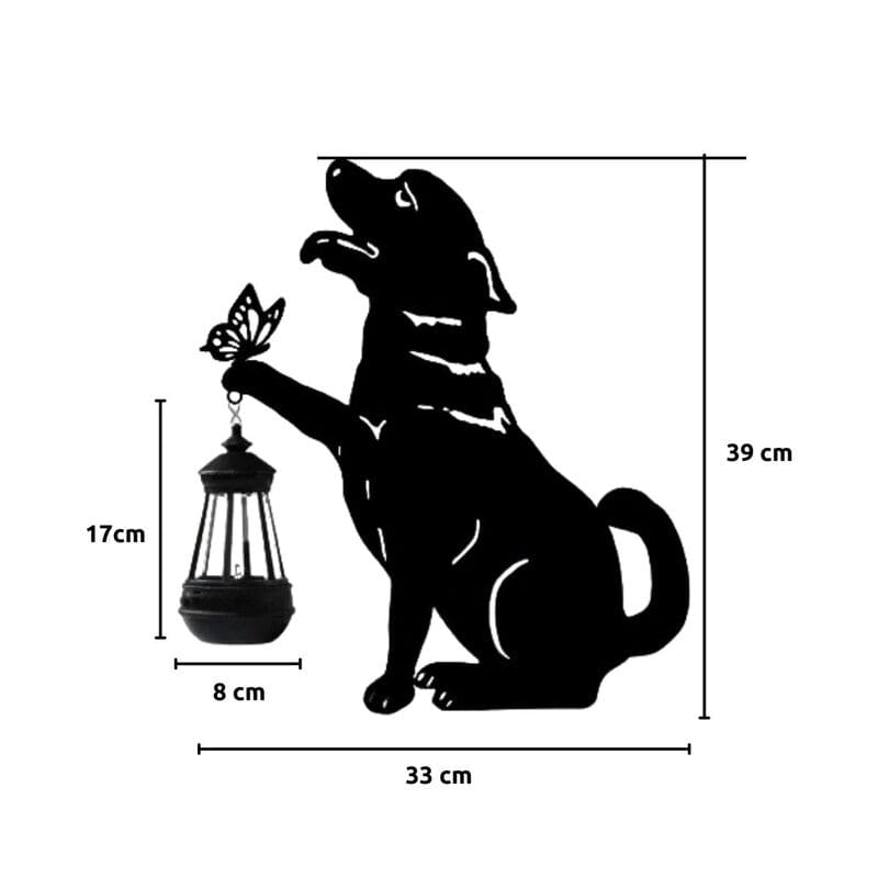 La silueta del perro junto a la linterna y mariposa crea una escena cálida y emotiva, ideal para amantes de los animales y la decoración con significado. Aporta personalidad y ternura a cualquier rincón.