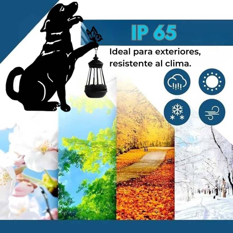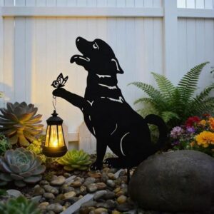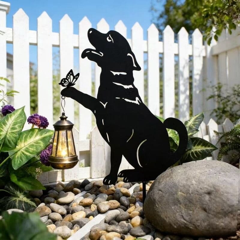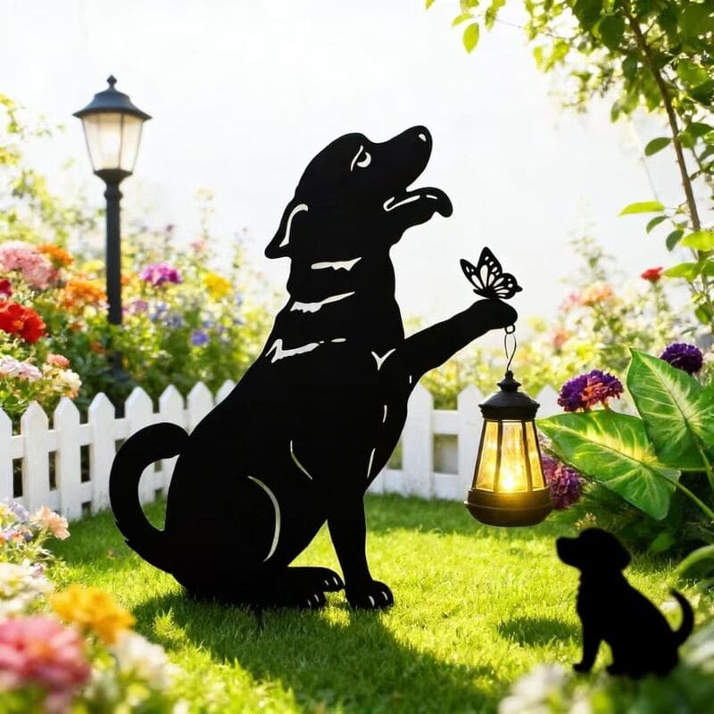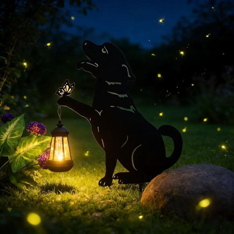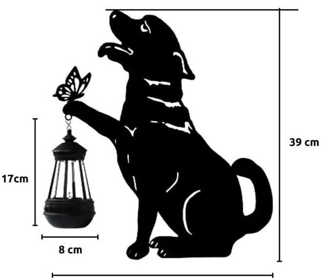 La silueta del perro junto a la linterna y mariposa crea una escena cálida y emotiva, ideal para amantes de los animales y la decoración con significado. Aporta personalidad y ternura a cualquier rincón.