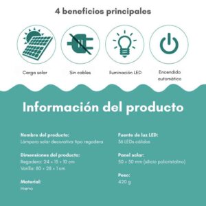 Cuenta con panel solar de alto rendimiento que se carga durante el día y se enciende automáticamente al anochecer. Disfrutá de iluminación sin consumo eléctrico ni cables.
